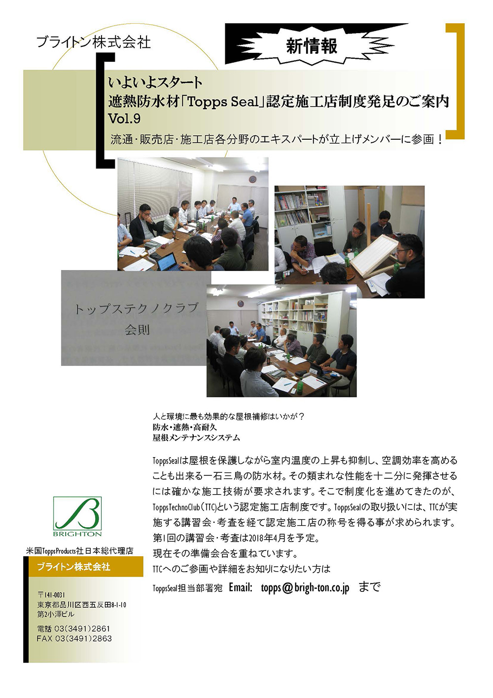 ToppsSealの取り扱いには、TTCが実施する講習会・考査を経て認定施工店の称号を得る事が求められます。